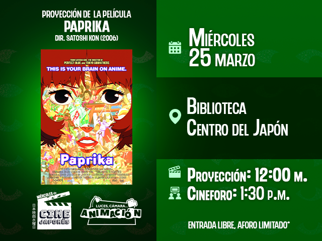 | Participa en la proyección de “Paprika”, la película icónica de Satoshi Kon que llevó la animación japonesa a un nuevo nivel de imaginación, surrealismo y exploración del inconsciente. Acompáñanos en esta experiencia cinematográfica donde conoceremos cómo el DC Mini, un dispositivo capaz de entrar en los sueños, desencadena un caos donde realidad y fantasía se mezclan hasta borrar sus límites. Una obra imprescindible para entender el legado de Kon y la influencia que Paprika dejó en el cine contemporáneo. La sesión contará con un cine foro para conversar sobre símbolos, capas narrativas y el fascinante universo visual que distingue esta película. Entrada libre hasta completar aforo. Dirigido a toda la comunidad |